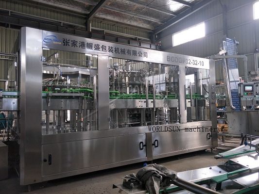 The bottles are transported to the three in one filling machine by the bottle air conveying system through the bottle shifting star wheel. The rotary table of the bottle punching machine is equipped with a bottle clamp, which clamps the bottle mouth and turns 180 degrees along a guide rail, Make the bottle mouth downward. In the specific area of the bottle washing machine, the nozzle sprays the bottle washing disinfectant or water to wash the inner wall of the bottle. After being washed and drained, the bottle is turned over 180 times along the guide rail under the bottle clamp, Make the bottle mouth up. The washed bottles are led out by the bottle washing machine through the star wheel and then transferred to the filling machine. The bottle entering the filling machine is held by the bottle mouth stuck by the bottle neck supporting plate. Filling valve through the valve lifting mechanism under the action of cam to achieve falling and rising. The pressure filling method is adopted. After the filling valve drops and contacts the bottle mouth, it opens to complete the filling process. After filling, the filling valve rises and leaves the bottle mouth, and the bottle enters the capping machine through the transition wheel of the bottle neck. The anti rotation knife on the capping machine blocks the bottle neck to keep the bottle upright and prevent rotation. The capping head keeps revolution and rotation on the capping machine. Under the action of cam, the capping head grabs, covers, spins and takes off the capping head to complete the whole capping process. The finished bottle is transferred from the capping machine to the bottle delivery chain by the bottle delivery wheel, and the three in one bottler is transferred by the delivery chain. The whole equipment is sealed by window sealing, the height of window sealing is higher than the equipment Zui high point, there are appropriate channels at the bottle inlet and outlet, and there are exhaust slots at the bottom of window sealing.